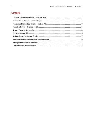 Step-by-step exam scaffold for use in an exam. Sets out clearly the applicable cases and legislation and the questions students must ask themselves when approaching any problem question. Includes exam tips and example responses for use in an exam. Relatively straightforward to apply. Topics covered include: - Trade and Commerce Power - Corporations Power - Freedom of Interstate Trade - Taxation Power - Grants & Excise - Defence Power - Implied Freedom of Political Communication - Intergovernmental Immunities - Constitutional Interpretation My notes are colour-coded (highlight) as follows: YELLOW = Cases GREEN = Legislation BLUE = Exam Tips