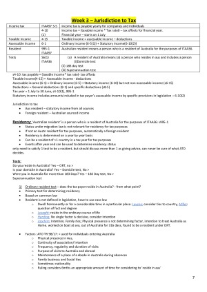 These notes helped me achieve a H1 in this subject! All examinable topics covered, Table of contents for easy access, cases and legislation sections highlighted for visibility during exam conditions. Topics Covered: Week 2 – GST Special rules: Importations and adjustments Week 3 – Jurisdiction to Tax Week 5 – Income Ordinary income – Statutory Income Taxing the worker – income from services Allowances Voluntary gifts and payments Week 6 – FBT Week 7 – Income from business Extraordinary and Isolated Transactions Week 8 – Income from Property and Capital gains Capital Gains Week 9 Deductions SPECIFIC DEDUCTIONS CAPITAL ALLOWANCES Week 11 – Taxation of other entities