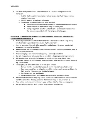 Detailed complete course notes organised by week. I have made these detailed notes using ALL assessable content for the course - lecture slides, lecturer comments and examples, tutorials and presentations, required readings of journal articles and textbook chapter. ALL the important information for WORK2203 to help you get a great mark for tutorial participation, your policy submission assignment and the final exam! Topics in my notes are according to the week they were taught 1. Introducing industrial relations policy 2. Work and industrial relations today: what are the problems? 3. What can and should governments do? 4. How did we get here? What has policy been about in Australia? 5. What is the Fair Work Act aiming to achieve? 6. Policy issues: The union problem 7. Policy issues: Work and family 8. Policy issues: Skills and immigration 9. Reading week (no lectures) 10. Policy issues: The productivity puzzle 11. Policy futures 12. Overview and exam primer 13. Reading week (no lectures) Notes for the required readings and all textbook chapters are also included in these notes: Week 1 - no readings Week 2 Befort & Budd (2009) – Invisible hands, invisible objectives (chapter 1) Week 3 Wright (2018) – Australian industrial relations in 2017 Clibborn (2019) – Australian industrial relations in 2018: Inequality, policy stagnation and a brewing storm Week 4 Hyman (2008) – The state in Industrial Relations Hancock & Lansbury (2016) – Introduction to industrial relations reform: Looking to the future (textbook chapter 1) Harris (2016) – Towards a new workplace relations framework? A View from the Productivity Commission (textbook chapter 9) Week 5 Cooper & Ellem (2008) – The neoliberal state, trade unions and collective bargaining in Australia Ellem (2010) – The making of industrial relations policy: Where are we now and how did we get here? Hancock (2016) – Reforming industrial relations: Revisiting the 1980s and 1990s (textbook chapter 2) Cooper (2016) – ‘Dead, buried, cremated’ and exhumed? Consensus in industrial relations policy and politics in Australia (textbook chapter 4) Week 6 Cooper (2009) – Forward with Fairness? Industrial Relations under Labor in 2008 Cooper & Ellem (2017) – Cold climate: Australian unions, policy, and the state Gillard (2009) – Foreword to the Journal of Industrial Relations Stewart (2016) – Continuity and Change in Australian Labour Regulation: Work Choices, Fair Work and the role of the ‘independent umpire’ (textbook chapter 4) Week 7 Gahan et al. (2018) – Unions and collective bargaining in Australia in 2017 Bray et al. (2019) – Unions and collective bargaining in Australia in 2018 Bray & Macneil (2016) – Reforming collective bargaining (textbook chapter 7) Week 8 Baird (2016) – Policy tensions: Women, work and paid parental leave (textbook chapter 5) Baird (2004) – Orientations to paid maternity leave: Understanding the Australian debate Baird & O’Brien (2015) – Dynamics of parental leave in Anglophone countries: The paradox of state expansion in liberal welfare regimes Week 9 - no readings Week 10 Oliver & Wright (2016) – Australia’s shifting skills ecosystem: Contemporary challenges in education, training and immigration (textbook chapter 8) Clibborn (2015) – Why undocumented immigrant workers should have workplace rights Wright (2015) – Why do states adopt liberal immigration policies? The policymaking dynamics of skilled visa reform in Australia Week 11 Productivity Commission (2015) – Workplace relations framework inquiry (issues paper 1: context) Productivity Commission (2015) – Workplace relations framework inquiry (issues paper 3: the bargaining framework) Peetz (2015) – Labour productivity and industrial relations Richardson (2016) – Productivity, wages and true measures of economic gain (textbook chapter 7) Week 12 - no readings Week 13 - no readings