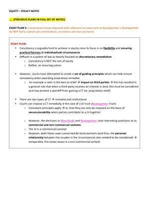This upload contains my theory notes put together (at a cheaper price). Note that you can also buy my detailed substantive notes as well. There aren't too many topics that can be covered in the theory component of the course. I prepared essays for each one of these topics - then in the final exam, I just copied the essay out. These notes contain essay plans and essay points (including fully-written responses) for the following topics and essay topics: - “All trusts are ultimately based on intention” - "The award of injunctions and specific performance is the product of unfettered discretion under the guise of fairness" - "Resulting trusts are express trusts found through relationships and conduct" - "Constructive trusts imposed with reference to cases such as Baumgartner v Baumgartner do NOT fairly capture all contributions, economic and non-economic" .... note I have extracted other essay topics as well in my notes. I have also prepared essays under the following broad topics: - Trusts - Institutional VS remedial debate tie into DISCRETIONARY - Fiduciary obligations - Equitable remedies - Compulsion remedies - Discretionary remedialism The notes are COLOUR CODED and HIGHLIGHTED to help in preparation for you exam. Good luck!