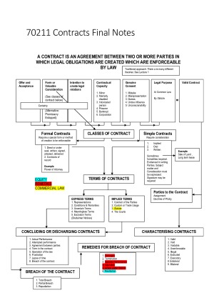 Comprehensive final exam notes covering all topics: - Nature of a contract - Agreement: Offer & Acceptance - Consideration - Intention - Certainty & Completeness - Privity - Estoppel - Capacity - Formalities / Part Performance - Illegality - Exclusion Clause - Express Terms - Implied Terms - Construing Terms - Misleading or Deceptive Conduct, Misrepresentation - Duress, Undue Influence, Unconscionable Conduct - Impropriety by third party - Mistake / Unilateral Mistake - Rescission/ Election - Termination, Breach and Repudiation, Frustration.