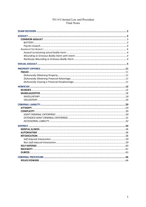 Comprehensive, colour coded final exam notes with easy scaffold to apply to any problem question! Topics: - ASSAULT - SEXUAL ASSAULT - PROPERTY OFFENCE - Fraud - HOMICIDE - Murder - Homicide - CRIMINAL LIABILITY - DEFENCES - CRIMINAL PROCEDURE