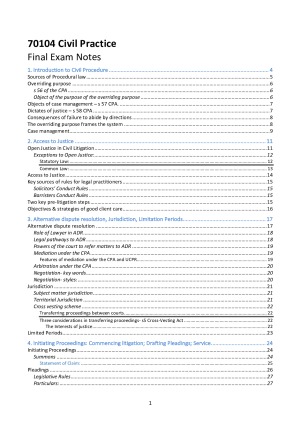 Comprehensive, colour coded final exam notes with answers to problems questions + weekly tutorial answers Covering all topics: - Introduction to Civil Procedure - Access to Justice - Alternative dispute resolution, Jurisdiction, Limitation Periods - Initiating Proceedings: Commencing litigation; Drafting Pleadings; Service - Evidence in Proceedings - Interlocutory Applications; injunctions - Costs as a Means of Managing Litigation; Costs Orders - Strike-out; Summary Disposal; Vexatious Litigants - Judgement enforcement