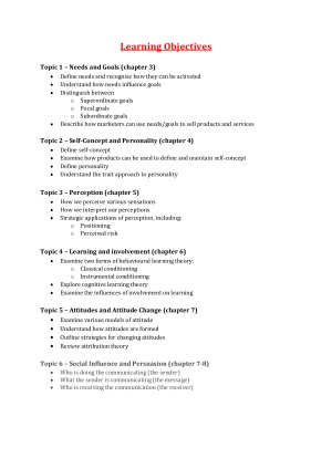 84 HD overall grade Up to date notes recently completed in Trimester 2 2019. Prevent wasting time creating your own notes and learn the unit and key concepts in one easy to follow document. Information is tied back to each learning objective with clear titles. Notes thoroughly covers weeks 1 - 11 and all topics. Learning objective checklist is also provided for simplified exam preparation. Topics: - Topic 1 – Needs and Goals - Topic 2 – Self-Concept and Personality - Topic 3 – Perception - Topic 4 – Learning and involvement - Topic 5 – Attitudes and Attitude Change - Topic 6 – Social Influence and Persuasion - Topic 7 – Family and Social Class - Topic 8 – Culture, Sub-Culture and Cross-Culture - Topic 9 – Automatic and Conscious Decision Making - Topic 10 – Consumer Influence and Diffusion of Innovations