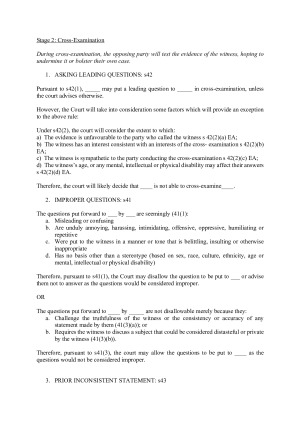 Amazing exam scaffolds - the only document i needed to take into the exam! Covers all topics and potential questions. Topics: - Burdens and Standards of Proof - Judicial Notice - Evidence Act Admissibility - Documentary Evidence and Real Evidence - Witness Evidence: Competence, Compellability and Swearing in - Witness Examination: examination in chief, cross examination, re examination, failure to call witnesses and evidence of silence - Relevance - Hearsay Rule - Credibility Rule - Character Evidence - Opinion Rule - Tendency Evidence - Coincidence Evidence - Discretionary/ Mandatory Rules - Warnings and Discretions - Privilege: Client Legal Privilege and Professional Legal Privilege