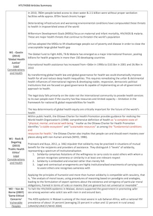 Summary of the Weekly Readings from weeks 1-11 Very useful in completing the final exam which comprises of 3 essays based on what you have learnt in the semseter W1 - Introduction to legal and ethical considerations W2 - Vulnerable Populations W3 - Ethics Module - Environmental Degradation & Health W4 - Environment Issues & Ethics W5 - Refugee Health W6 - Media, social media & public health W7 - Global issues, corporate misconduct & health (tobacco industry & medicalisation of smoking cessation) W8 - Health systems law & governance W9 - Issues in health - vaccinations and screenings W10 - Protecting whistleblowers, health and wealfare in pacific islands W11 - Global issues (food & drink, policies & public health)