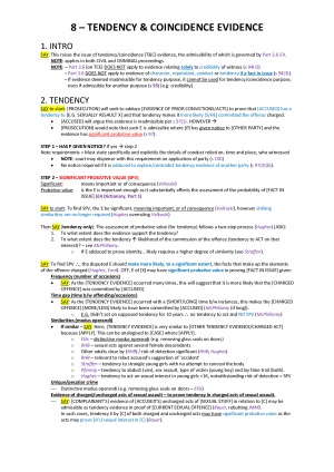 Top notes for Evidence. Received score of 85 (HD). Includes lecture notes (with instructions and process) and script notes. Topics covered – Intro – Relevance – Competence and Compellability – Privilege – Examination of Witnesses – Character and Credibility – Accused's Right to Silence – Tendency/Coincidence Evidence – Hearsay – Admissions – Illegally Obtained Evidence – Opinion Evidence