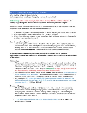 Week 1: Religion/How do we define religion 2 Week 2: Different Approaches to Religion 4 Week 3: Cosmology and Cosmogony 5 Week 4: Myth 8 Week 5: Rituals 11 Week 6: Witchcraft and Sorcery 13 Week 7: Spirit Possession, Spirit Mediumship, and Shamanism 15 Week 8: Gender and Sex 18 Week 9: Religion Through Music 21 Week 10: Body Modification in Religion 23 Week 11: Religion Fundamentalism 26 TUTORIAL AND LECTURE READINGS (for the quiz) 29 WK 2: Anthropology and Religion ReadinG 29 WK 3: Natural Symbols Reading 33 WK 3 TUT: Ethos, World-view and the Analysis of Sacred Symbols Reading 38 WK 4: Anthropology and Religion: What we Know, Think, and Question Reading CH 6 41 WK 5: Anthropology and Religion: What we Know, Think, and Question. Ch 7 48 .