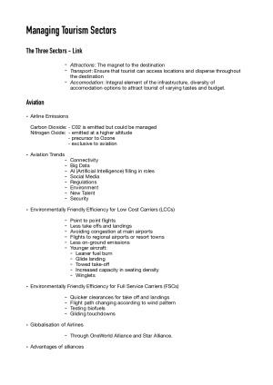 A brief summary of weekly lecture and tutorial information covering most topics for a quick exam preparation. Information includes: 1. Aviation Trends Environmentally Friendly Initiatives for LCCs and FSCs Airline Trends, Promotion and Distribution 2. Cruising Cruising Trends, Promotion and Distribution 3. High-Speed Rail Advantages of High-Speed Rail 4. Accommodation Accommodation Trends, Promotion and Distribution Brand Differentiation Multibranding Accommodation Issues Niche tourism LCC model in Accommodation Operations Star Ratings Accommodation Globally Hotels and the Environment: Issues and Benefits 5. Business Tourism How business travel increases tourism Issues for business travellers 6. Attractions Promotion and Distribution Trends 7. Tourism Distribution Distribution and preferred relations 8. Simon Elsegood Guest Speaker 9. Peter Kollar Guest Speaker 10. Risk and Reputation Management Airline Risks Rail Risks Cruise Risks Attraction Risks Event Risks Accomodation Risks 11. Major Associations