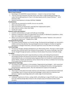 Lectures 1-13 Psychology Lectures 1- Intro 2 - Intro to Development Psych 3 - Development Psych 4 - Social Psych 5 - Persuasion 6 - Perception 7 - Perception pt 2 8 - Organisation Psych 9 - Organisartin Psych pt 2 10 - Attention and Awareness 11- Memory 12- Health Psych Lectures 1-10 Stats Lectures
