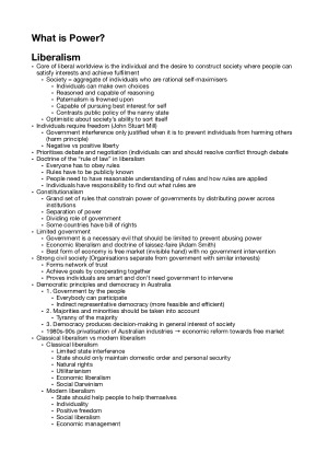 Final mark: HD - Lecture notes - Notes from readings - Notes from tutorials Topics covered: - Introduction (What is politics? What is power) - Liberalism - Liberalism’s critics - Rights - Justice - Democracy - Legislature - Executive - Judiciary - Interest Groups - Political Parties - Social Movements