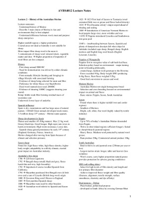 This unit will be easy and you will definitely pass if you study these notes. The course coordinator sometimes doesn't upload all slides to encourage students to attend lectures as opposed to watching them online. These notes contain all the information. Lecture 2 - course introductory (not included because no content taught) Lecture 3 - History of Australian Merino Lecture 4 - Wool physical characteristics and quality determinants Lecture 5 - Nutritional management of merino sheep Lecture 6 - Prime lamb production Lecture 7 - Beef cattle production Lecture 8 - Meat grading and quality determinants Lecture 9 - Meat processing Lecture 10 - Resource management and drought strategies Lecture 11 - Livestock production in developing countries There are no additional readings for the unit.