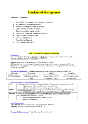 These notes are comprehensive and detailed and include all lecture, tutorial and textbook chapter material :) Easy to read, understand and memorise with supporting graphs, tables, definitions and examples! Topics covered: - Introduction to management, managers, managing - Managing in a global environment - Strategic planning and decision making - Organisational culture & structure - Organising and managing people - Organising change and managing resistance - Organisational communication - Leadership and power - Foundations of control - Ethics, sustainability, CSR