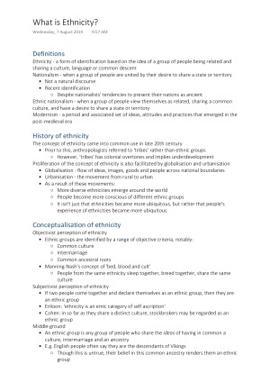 Comprehensive notes for the lectures of Ethnic Nationalism in the Modern World. These notes helped me achieve a score of 87, and I had my final essay circulated by the coordinator as a H1 sample. Includes the following topics: - Introduction - What is Ethnicity? - What is Nationalism? - Ethnic Formation - National Selves and Others - National Memories - National Ontologies and Metaphors - Gender and Sexuality in the Nation - National Infrastructures and Culture - Long Distance Nationalism - Summary Lecture