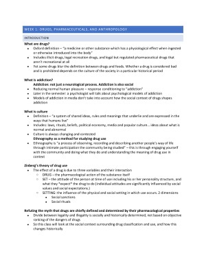 Week 1: Drugs, Pharmaceuticals, and Anthropology Introduction Ethnographies of Drug Use Psychedelics/Hallucinogens Drug Symbolism and Drug Law Reform Week 2: Cannabis and Cocaine Cannabis Cocaine Week 3: Neuropharmacology Drug Abuse and Addiction War on Drugs A Law Enforcement Perspective on Drugs Case Study 1- Cocaine Supply Case Study 2- Cocaine Supply Case Study 3- Methylamphetamine Case Study 4- Cannabis/Methylamphetamine Supply Drugs & Incarceration Alcohol, Drugs, and Indigenous Australia Week 4: Opiates and Tobacco Political Economy of Opiates Opium:the social construction of the ‘debilitated addict Political Economy of Tobacco and public health debates about e-cigarettes Sacred Tobacco Week 5: Sexual health drugs and placebo Erectile Dysfunction Drugs Emergency Contraception Placebos and the Meaning Effect