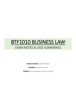 All content for the BTF1010 Business Law Exam including: - Australian Consumer Law - Law of Torts (Negligence): Physical Harm & Negligent Misstatement - Business Organisations: Partnerships and Corporations Extensive notes covering all content relevant to the exam including a table of summaries of all relevant case studies and their relevant theories with textbook chapter references. Combination of lectures, tutorial and textbook information. Includes a content page for easy access and direction through the notes and topics are colour orientated. These notes are very colourful and done to make the notes clear and easily organised.