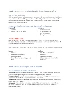 This concise summary of Clinical Leadership and Patient Safety covers all the objectives learnt throughout the unit, including: - Patient Safety and Clinical Quality in Ambulance Services - Clinical Performance Indicators - Evidence Based Practice in Leadership - Human Factors in Diagnostic Errors These objectives have been answered according to the readings and lecture slides for that week. It is a great study tool for the VIVA as well as the quiz.