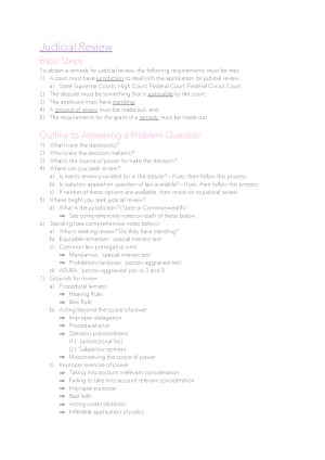 These notes are extremely comprehensive and with them, I was able to achieve a distinction in the final examination. They are clear, well formatted and easy to follow and will provide you with a more in-depth understanding of the topic. Topics covered Merits Review (Cth and SA) Statutory Appeal on Questions of Law Judicial Review (Cth and SA) - Justiciability - Standing - Grounds - Delegated Legislation Jurisdictional Error Remedies Bonus: comprehensive Project Blue Sky Test step guide