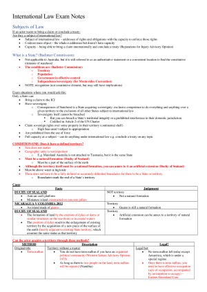 Exam notes I used for the final exam, which I scored a D on. Includes the topics: Subjects of Law (State, IO) Sources of Law (Treaties, CIL) IWA State Responsibility Settling Disputes Peacefully Horizontal Measures of Peaceable Self Help Self Defence Collective Security System (Ch 7 of the UN Charter)
