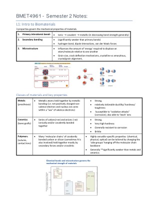 Struggling with the lectures and the tutorials. If you don't want to wake up for 10am lectures, take these concise summary notes that cover all dense lecture and a summary of the tutorial materials. These are brilliant notes for you to ace those weekly quizzes and blitz that final exam while saving all the stress! It's not a lot of money to buy these notes to ensure you pass the course! Topic List: Week 1 Lecture: Introduction to Biomaterials Week 2 Lecture: Foreign materials in tissues and the body's response Week 3 Lecture: Metals and metal alloys in biomedical engineering - their strengths and fatal flaws Week 4 Lecture: Polymers and hydrogels - soft and versatile Week 5 Lecture: Ceramics and glasses - if only they were tough Week 6 Lecture: Materials in biomedical devices and implants Week 7 Lecture: Introduction to Biomechanics + whole body biomechanics Week 8 Lecture: Stress, strain, extension and torsion, and biomechanics of bone and other load bearing tissues Week 9 Lecture: Pressure inside tubes and vessels - biomechanics of biological conduits Week 10 Lecture: Fluid biomechanics and the flow of blood Week 12 Lecture: Viscoelasticity of soft tissues