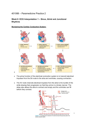 These notes contain lecture content, content from readings and practical notes. The first part of the notes is a comprehensive overview of all lecture content plus extra notes I may have had. These include images to assist with learning concepts. The second part is a summary from the textbook Huszar's Basic Dysrhythmias. The third part includes the vital notes that I made for the VIVA at the end of semester. The notes are in order of primary survey, secondary survey followed by assessments and analgesia (with doses, contraindications etc.) These notes would be an excellent addition to your study for this unit and helped me to achieve a HD and I hope they can help you do the same. Topics Included: - Week 0: ECG Interpretation 1 - Week 2: ECG Interpretation 2 - Week 4: Parenteral Drug Administration - Week 6: Pain Assessment and Management - Week 8: Pain Management - Week 11: Spinal Immobilisation - Week 13: Review *** Lectures were held every second week *Disclaimer: NSW Ambulance pharmacology protocol has been used. An updated version has been released since the writing of these notes.
