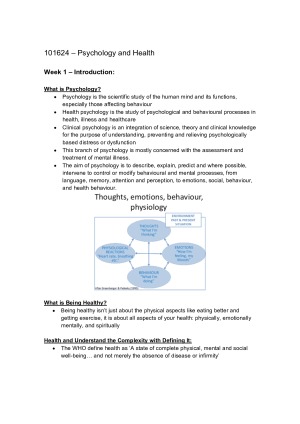 Great notes for the unit psychology and health. Includes notes from lectures and readings. Comprehensive notes that allowed me to achieve a HD in this unit. Hopefully they can help you achieve that mark as well :) Topic List: - Week 1: Introduction - Week 2: Psychology of Health - Week 3: Models of Health and Illness - Week 4: Behaviour Change - Week 5: Psychological Interventions for Health Concerns - Week 6: Psychology of Abnormality - Week 7: Mood Disorders - Week 8: Anxiety Disorders - Week 10: Other Psychological Disorders - Week 11: Other Psychological Disorders 2 - Week 12: Psychological Aspects of Injury and Illness - Week 13: Psychology of the Patient - Week 14: Review