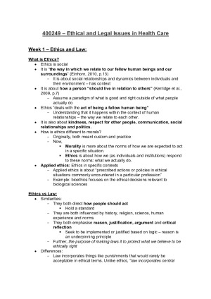 Complete Notes for Ethical and Legal Issues in Health Care. These notes are based off both the 14 weeks of lecture content and also includes notes from readings for this unit. Achieved a D with these notes. Topic list: - Week 1: Introduction to Ethics and Law, Principle-Based Ethics, Ethical Theories - Week 2: Definitions and Sources of Law, Division of Law and the Court Hierarchy, Legal Principles - Week 3: Principle Based Ethics - Week 4: Negligence and Defences to Negligence - Week 7: Sanctity of Life vs Futility of Life - Ethical Considerations - Week 8: Controversial Health Topics - Euthanasia, Abortion, Organ Transplant - Week 9: Professional Obligations, Public Health vs Individual Rights - Week 10: Law and Pharmaceutical Companies - Week 11: Evidence Based Medicine vs Complementary Medicine