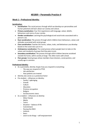 Complete notes for the unit Paramedic Practice 4. Includes lecture notes, notes from readings and notes from self-directed topics. Topics include: - Professional Identity - Simulations - Debriefing - Managing Low Acuity Patients - Ethical Dilemmas - Fieldwork Learning - Professionalism - Teamwork - Self-care Received a distinction for this unit. *Disclaimer: NSW Ambulance pharmacology protocol has been used. An updated version has been released since the writing of these notes.