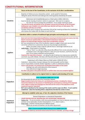DISTINCTION - JURD7285 NOTES FOR FINALS - Comprehensive and concise notes for content covered in JURD7250 FEDERAL CONSTITUTIONAL LAW - Clearly labelled and separated sections - Includes all relevant statutory provisions - Made up of lecture notes, content from textbooks, some exam prep in the form of simple easy-to-scaffolds for more complex topics and my own individual summaries and concepts - UP TO DATE T3, 2019 TOPICS COVERED: - Constitutional Validity - Characterisation - External Affairs Power - Defence Power - Trade & Commerce Power - Corporations Power - Tax Power - Grants Power - Race Power - Federal Compact - Freedom of Trade and Commerce - Implied Freedom of Political Communication - Judicial Power