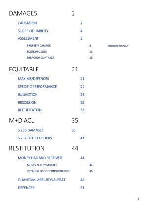 COMPLETE REMEDIES EXAM NOTES - Colour coded - Easy structure to follow - Condensed but highly comprehensive - Assist with all assignments and particularly the final exam Topics - Damages - causation, scope of liability, assessment - Equitable remedies - maxims, specific performance, injunction, rescission, rectification - Misleading deceptive conduct - s 236 damages, s 237 - Restitution - money had and received, quantum meruit, defences