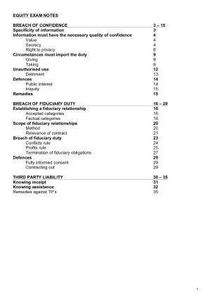 HD exam notes for the Monash equity unit. Includes a table of contents, summaries of every case in the unit and all legislation in the unit. All prescribed textbook readings are covered. All references to cases are coloured orange and all references to legislation are coloured green for easy reading in an exam situation!