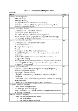 Detailed and colour coordinated EDF4123 notes from tutes and prescribed readings. All notes organised neatly into sections with subheadings, diagrams, tables and pictures. Includes all the necessary information to complete the assignments. Notes have been summarised concisely, and are easy to read.