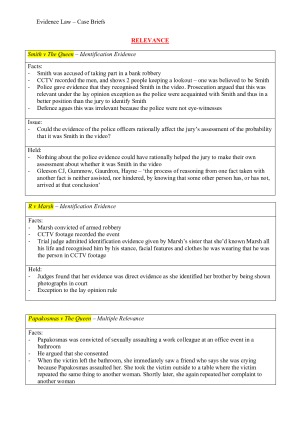 Essential Case Briefs relating to Relevance, Hearsay Evidence, Admissions, Opinion Evidence, Tendency and Coincidence Evidence, and Character and Circumstantial Evidence.
