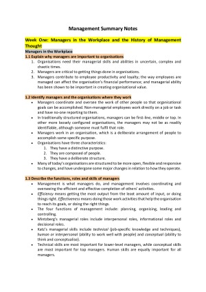 Comprehensive, colour coordinated and easy to read study notes. Topics include: - Managers in the Workplace and the History of Management Thought - Individual Behaviour - Perception, Personality, Attitudes and Values - Learning and Motivation - Groups and Teams - Communication - Decision Making - Leadership - Organisational Structure and Design - Organisational Culture - Organisational Change - Planning and Control - Social Responsibility and Managerial Ethics
