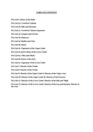 Notes from each of the 12 Pre-Labs, topics include: Bones of the Skull Vertebral Column Ribs and Sternum Vertebral Column Ligaments Scapula and Clavicle Humerus Radius and Ulna Hand Ligaments of the Upper Limb Bones of the Lower Limb Tibia and Fibula Bones of the Foot Ligaments of the Lower Limb Muscles of the Trunk Muscles of the Upper Limb I: Muscles of the Upper Arm Muscles of the Upper Limb II: Muscles of the Forearm Muscles of the Lower Limb: Muscles of the Hip and Thigh Muscles of the Lower Limb: Muscles of the Leg and Intrinsic Muscles of the Foot Images are included with labels, very effective when studying for the lab exam.