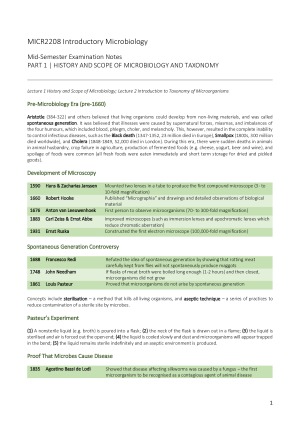 Comprehensive study package covering all lecture content assessed in the MICR2208 mid-semester exam. Notes are sourced directly from lecture recordings and Prescott's Microbiology 10th Ed. Notes are split into 8 parts and are accompanied by tables that summarise the content to consolidate learning. Topics include: - Part 1 - History and Scope of Microbiology and Taxonomy (L01-L02) - Part 2 - Prokaryotic Structure and Function (L03-L04) - Part 3 - Characteristics and Diversity of Bacteria (L05-L06) - Part 4 - Characteristics and Diversity of Archaea (L07) - Part 5 - Eukaryotic Structure and Function (L08) - Part 6 - Characteristics and Diversity of Fungi (L09) - Part 7 - The Protists (L10-L11) - Part 8 - Viruses and Other Acellular Infectious Agents (L13-L14) *L12 not included as it was a review lecture