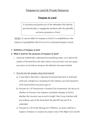 Comprehensive exam notes covering all essential parts of the torts course enabling a 90%+ score on the exam! Notes cover the following areas: - Trespass to the person & defences - Trespass to land (including consent & necessity) & private nuisance (including coming to the nuisance, statutory authorisation, abatement, damages & injunctions) - Negligence (DOC, PEL, PMH, Breach, Causation, Remoteness) - Defences for negligence - Limitations of actions, damages, contribution and indemnity between tortfeasors & vicarious liability - These notes are organised in a coherent and logical manner with subheadings, bolding and numbering hence are easy to follow and comprehend - Only includes important information - not all the unnecessary background that is covered in lectures, workshops and readings - Notes are written out in full (including introduction and conclusion) hence essentially act as a template in the exam - rather than thinking about legal principles or phrasing of the answer, time can be used most effectively by analysing the facts and formulating cogent arguments - Relevant cases and legislation from reading guide referenced throughout notes - Notes also include a summary of each tort outlining all key elements to be discussed and exam tips section