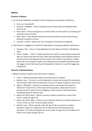 Concise but comprehensive notes covering most of the content examinable via problem questions. Sub-topics which are missing include 'the unborn and their parents' (Topic 8), 'police tort claims' (Topic 13) and 'agency' (Topic 13). Notes are formatted with subheadings and numbered lists based on a suggested structure to answer problem questions. The structure is not meant to mimic the literal structure of the essay but rather an order by which to consider issues. Types of cases (including their defences and damages) covered include: - Battery (and Medical Battery) - Assault - False Imprisonment - Action on the Case for Wilfully Inflicted Psychiatric Injury - Statutory Action for Psychiatric Injury to Victims of Intentional Torts - Negligence Topics relevant to cases covered include: - Vicarious Liability - Survival Claims - Compensation to Relatives Claims - Action for the Loss of Services of an Employee General tips section at the front for a big-picture view.