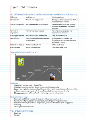 All topics from weeks 1 to 11 are covered in these notes. important sections have been highlighted as well as notes about examinable material. Information that was noted as being not of use to the exam has been excluded to minimise wasting time on irrelevant information. Topics Covered: Topic 1: SME Overview Topic 2: Business Process Advisory - Business Planning and Start-Up Stage Topic 3: Advisory - Business Planning Start-Up Stage Topic 4: Business Process - Advisory Business Planning Topic 5: Small Business Tax Deductions and Concessions Topic 6: Small Business Life Cycle and Growth Topic 7: Advisory at Growth Stage Topic 8: Environmental Management and Reporting Topic 9: GRI Reporting Framework for SME Topic 10: Risk Management Advisory for SME Topic 11: Risk Management