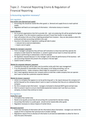 These notes cover topics 1 to 7 which are the topics covered in the in class tests which make up 40% of the overall mark. The in class tests have a strong emphasis on theories, which can be assisted by these notes as it is an open book exam. These notes can assist for the remaining assessments as they have a focus on these topics, in addition those assessments are assignments meaning they too are open book. Topics Covered: Topic 1: Introduction to accounting theory Topic 2: Financial reporting, environmental and regulation of financial reporting Topic 3: International accounting Topic 4: Positive accounting theory Topic 5: Normative accounting theories - The conceptual framework Topic 6: Unregulated corporate reporting decisions - systems orientated theories Topic 7: Extending corporate accountability - social and environmental accounting