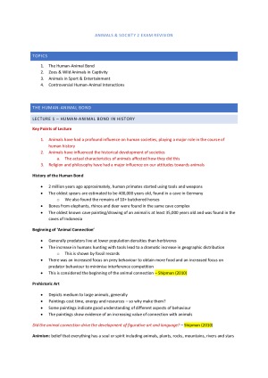 This is for Animals & Society 2: Humans & Animals (ANSC20004) - formerly DASC20014. This document includes all lectures except Lecture 7 & 9 which were not given to us because the lecture fell on a public holiday. All examinable readings as well as content discussed in tutorials is included. As the exam consists of MCQ, short answer and long answer responses, this document was really useful for me to consolidate all the examinable content and create practice exam questions (which I am also selling separately). Topics: 1. The Human-Animal Bond 2. Zoos & Wild Animals in Captivity 3. Animals in Sport & Entertainment 4. Controversial Human-Animal Interactions Lecture 1: Human-Animal Bond in History Lecture 2: Psychology of the Human-Animal Bond Lecture 3: Human-Animal Interactions Lecture 4: History of Keeping Wildlife in Captivity Lecture 5: Ethics of Keeping Wildlife in Captivity Lecture 6: Wildlife as Pets Lecture 7: N/A Lecture 8: Animals on Show Lecture 9: N/A Lecture 10: Animals in Research Lecture 11: Hoarding or Rescuing? Lecture 12: Controversial Cultural Attitudes Tutorial Reading: The Healing Role of Assistance Dogs Tutorial Reading: Ethics of Zoos/Compassionate Conservation Tutorial Reading: Animal Welfare Assistance