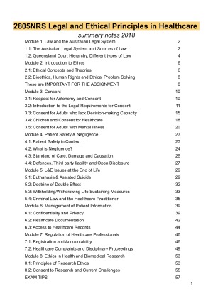 This comprehensive summary includes all 8 Modules of content (all the way from the Australian Legal System to Ethics in Biomedical Research), including outlines of the relevant key "common law" cases. Using these resources, I scored 89% on the assignment task and 91% on the EOS exam, and with these notes, I'm confident you can too! To further help out, I've highlighted some key areas relevant to the assignment, and provided some helpful EOS exam tidbits on the last page.