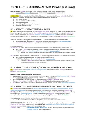 Top notes for Constitutional Law. Received score of 87 (HD). Includes lecture notes (with instructions and process) and script notes. Topics covered: – Topic 1: Fundamental Concepts, Institutions and Instruments – Topic 2: State Legislative Power – Topic 3: Making State Constitutions Rigid – Manner and Form – Topic 4: Executive Power – Topic 5: Commonwealth Legislative Power – Topic 6: External Affairs Power – Section 51(xxix) – Topic 7: Corporations Power – Section 51(xx) – Topic 8: Spending Powers – Topic 9: Implied Intergovernmental Immunities – Topic 10: Separation of Judicial Power – Topic 11: Implied Political Freedoms – Topic 12: Section 92 – Freedom of Interstate Trade and Commerce – Topic 13: Inconsistency – Section 109