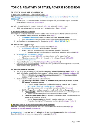 Top notes for Property B. Received score of 81 (HD). Includes lecture notes (with instructions and process) and script notes. Topics covered: 1. THE CONCEPT OF PROPERTY 2. FRAGMENTATION OF PROPRIETARY INTERESTS 3. AN INTRODUCTION TO TITLE TO LAND 4. AN INTRODUCTION TO LEGAL AND EQUITABLE INTERESTS IN LAND 5. THE DOCTRINES OF TENURE AND ESTATES; LIFE ESTATES 6. THE DOCTRINE OF RELATIVITY OF TITLES; ADVERSE POSSESSION 7. ACQUISITION AND TRANSFER OF PROPRIETARY INTERESTS; SALE AND GIFT PROPERTY 8. LEASEHOLD ESTATES 9. CREATION OF LEASEHOLD INTERESTS 10. THE BORDERLINE BETWEEN CONTRACT AND PROPERTY: CONTRACTUAL LICENCES 11. SERVITUDE INTERESTS 12. RESTRICTIVE COVENANTS 13. SECURITY INTERESTS