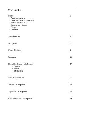 Covers weeks 1-12: - Basics (CNS, PNS, Neurons, Neurotransmitters, Action Potentials, Addiction, Sleep) - Consciousness - Perception - Visual Illusions - Attention - Language - Thought, Memory, Intelligence - Brain Development - Cognitive Development - Gender Development - Adult Cognitive Development