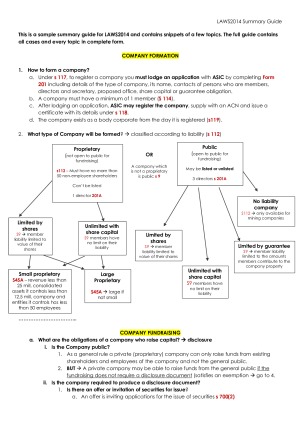This is a complete summary guide in flow chart form for Corporations Law (LAWS2014/LAWS5014). The sample contains snapshots of various topics so you can see the layout of the notes. The full guide contains the complete version of the notes that covers all cases and topics. All topics covered including: Company Formation, Company Fundraising, Corporate Insolvency, Corporate Personality, Corporate Constitution, Corporate Decision Making, Members Meetings, General Law Liability in Contract & Tort,Statutory Civil Liability, Corporate Criminal Liability, Directors' and Officers' Duties, Members Rights and Remedies.