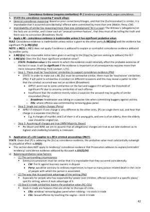 Completed Evidence in Sem 2, 2019 (with Jonathan as CE and Fiona Hum). Achieved a High Distinction (86). Notes include the following topics and pre-written scripts (includes case summaries from Reading Guide 2019). - Relevance - Competence and Compellability - Alternative Arrangements under the Criminal Cases - Privilege - Examination of Witnesses - Credibility and Character (Disposition of Evidence) - Delay in Prosecution and Forensic Disadvantages - Right to Silence - Tendency and Coincidence - Hearsay - Admission - Illegally/ Improperly Obtaining Evidence - Opinion Evidence