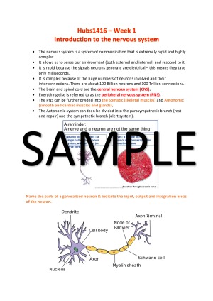 Study Notes from HUBS1416 Advanced Human Bioscience - Newcastle University Semester 2, 2019. These notes are extremely detailed. They easy to read and written in a way that should help you learn the subject. They cover all lectures and lectorials (questions and answers), as well as some practice quiz questions and answers. Topics covered: Week 1 - Introduction to the nervous system Week 2 - The Peripheral Nervous System Week 3 - The Central Nervous System Week 4 - Pharmacology Introduction Week 5 - Pharmacology of Major Drug Classes Week 6 - Introduction to Microbiology Week 7 - Microbiology 2: Infection Control & Prevention Week 8 - Introduction to Immunology Week 9 - Immunology 2 Week 10 - Introduction to Genetics Week 11 - Genetics 2: Inheritance Patterns and Genetic Testing Disclaimer: These are the notes I made while studying for this subject. Every effort has been made to ensure they are correct. However, I cannot guarantee they are 100% error free. In saying that I studied from these and I got an overall mark of 95%. I had to spend a lot of time making these notes and if I had them already done I could have spent more time memorising them and would have got an even better mark.