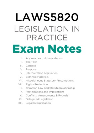 Detailed exam notes for Legislation in Practics. Structured to answer problem questions and essays. Covers the content from lectures and tutorials, and includes case summaries and relevant statutory provisions. Print ready. Topics covered: 1. Approaches to Interpretation 2. The Text 3. Context 4. Purpose 5. Interpretation Legislation 6. Extrinsic Materials 7. Miscellaneous Statutory Presumptions 8. Rights Protection 9. Common Law and Statute Relationship 10. Rectifications and Implications 11. Conflicts, Amendments & Repeals 12. Delegated Legislation 13. Legal Interpretation