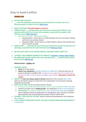 Detailed notes entirely in problem question structure, including - • Overview of all duties and unit (for quick reference in exam) • Duty of Care, Skill and Diligence • Duty to Avoid Conflicts • Related Party Transactions • Duty of Good Faith, Best Interests and Proper Purposes • Corporate Contracting • Member's Remedies • Relief and Ratification of Duties • Statutory Relief from Liability